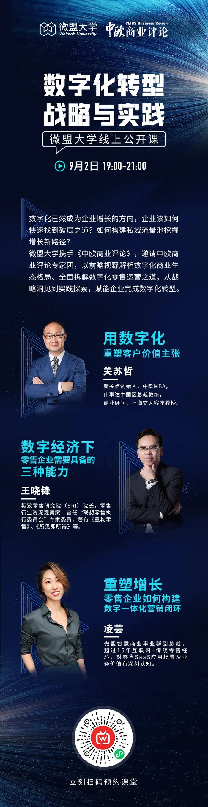 2020年9月2日19:00,《中欧商业评论》携手微盟大学,邀请微盟智慧商业事业群副总裁凌芸、新关点创始人、伟事达中国区总裁教练、上海交通大学客座教授关苏哲、极致零售研究院(SRI)院长王晓锋三位专家开展直播。