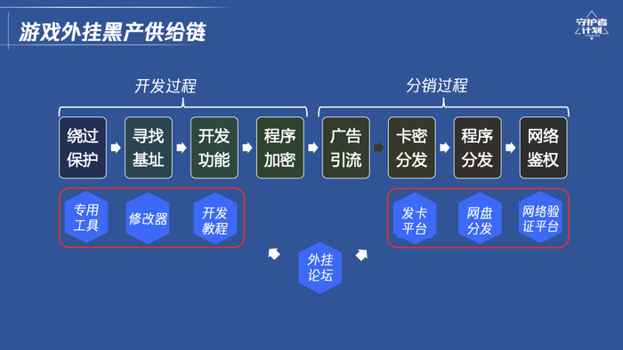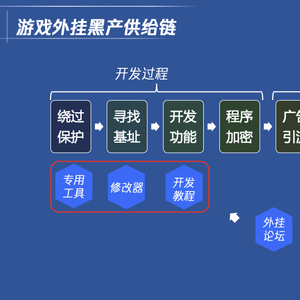 腾讯守护者计划的安全专家杜勇称,随着网络游戏外挂黑产的发展,一些国内外技术达人,制作出专用的驱动调试工具和逆向分析工具。从此,外挂作者告别了需要凭“一己之力”编写外挂程序的繁琐过程,只需通过这些技术化工具,即可轻松进行外挂程序编写,大大降低了游戏外挂开发的准入门槛。同时,泛滥的外挂论坛公开了大量的外挂开发教程,为作者们提供了更加便捷的信息获取渠道,助力网络游戏外挂的程序开发。