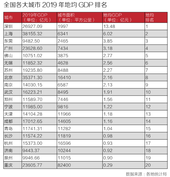 2019年深圳GDP为26927.09亿元,城市排名仅次于上海、北京。其城市面积为1997平方公里,地均GDP为13.48亿元,位居全国第一名,比地均GDP第二名的上海6.02亿元,高出一倍多,是广州的4倍、北京的6倍。