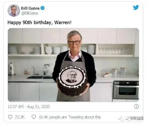 比尔盖茨亲手做的蛋糕中央,还有一个微笑的巴菲特。