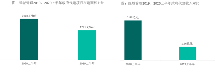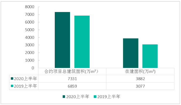 图:绿城管理2019、2020上半年合约项目总建筑面积、在建面积对比