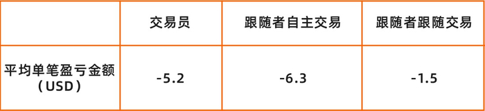 数据显示社区用户平均每笔要亏损5.2美元,相比起交易员和跟随者自主交易的盈亏情况,跟随者跟随交易的亏损金额要低许多。