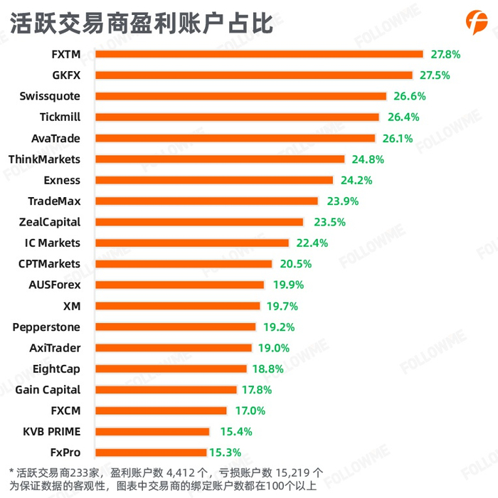 数据显示,2020上半年社区活跃交易商盈利交易账户平均占比为22.5%,下图为活跃交易商盈利账户占比排名表: