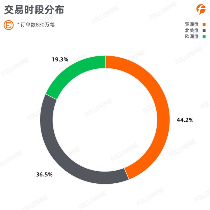 一般而言,外汇市场中欧盘和美盘交易量最多,特别是欧美时段相交的时候。然而,FOLLOWME 交易社区数据显示2020上半年社区80.7%的交易发生在亚洲时段和北美时段,从具体数据来看,全球交易者亚洲时段交易量最为活跃,高达44.2%,北美时段紧随其后,为36.5%,欧洲时段最少,仅占19.3%。原因是 FOLLOWME 交易社区近90%的用户都来自东亚和东南亚,看盘做交易的时间集中在空闲时段较多的早上和晚上。