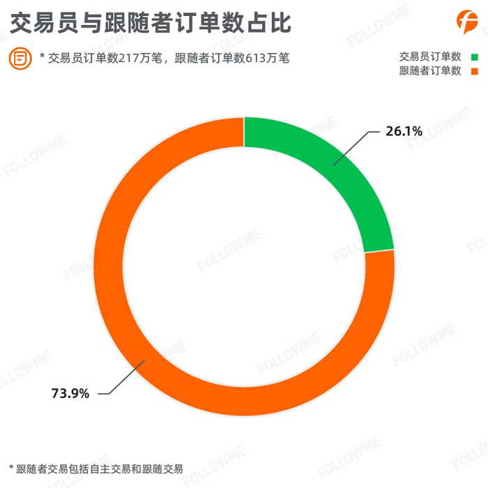 2020上半年 FOLLOWME 交易社区产生的订单数一共830万笔,其中交易员产生的订单数约217万笔,占比为26.1%,跟随者产生的订单数约为613万笔,占73.9%。