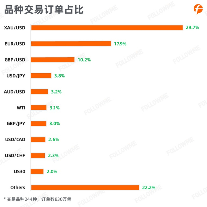 FOLLOWME 交易社区2020年上半年交易者共交易过包含外汇货币对、贵金属、原油、指数等在内的244个交易品种,其中交易订单数量最多的是 XAU/USD,占比高达 29.7%,遥遥领先,其次是 EUR/USD 和 GBP/USD,占比分别为17.9%和10.2%,热门交易品种 TOP 10 的交易订单数占总订单数的77.8%。从品种分类占比来看,244个交易品种中,外汇占60%,贵金属占30%,原油和指数各占5%。