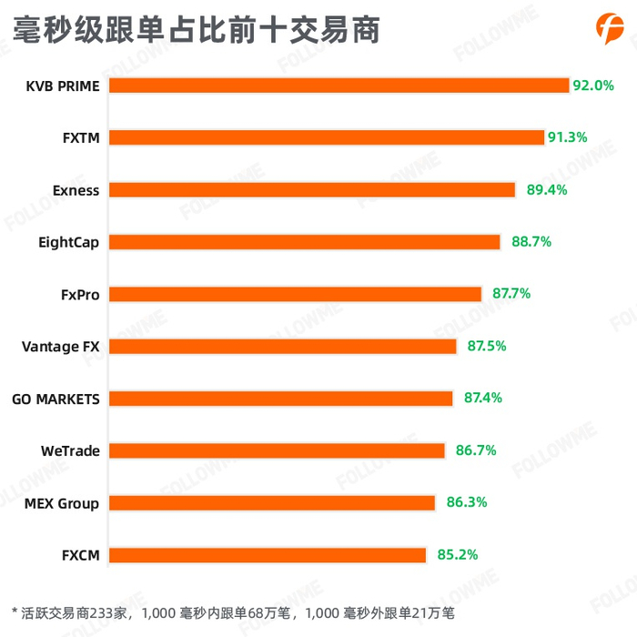 FOLLOWME 交易社区2020上半年各交易商账户跟单近90万笔,其中68万笔跟随订单的开平仓在 1,000 毫秒内完成,占比达到76.1%。