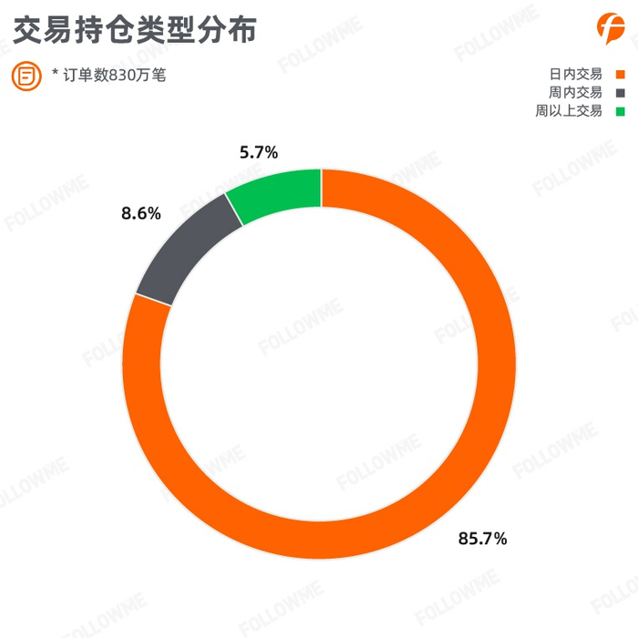 从持仓类型来看,数据显示,2020上半年 FOLLOWME 社区交易者最钟爱日内交易,日内交易订单数占总订单数的85.7%,持仓一周以上的交易占5.7%,表明大部分的交易用户都倾向于进行日内交易。