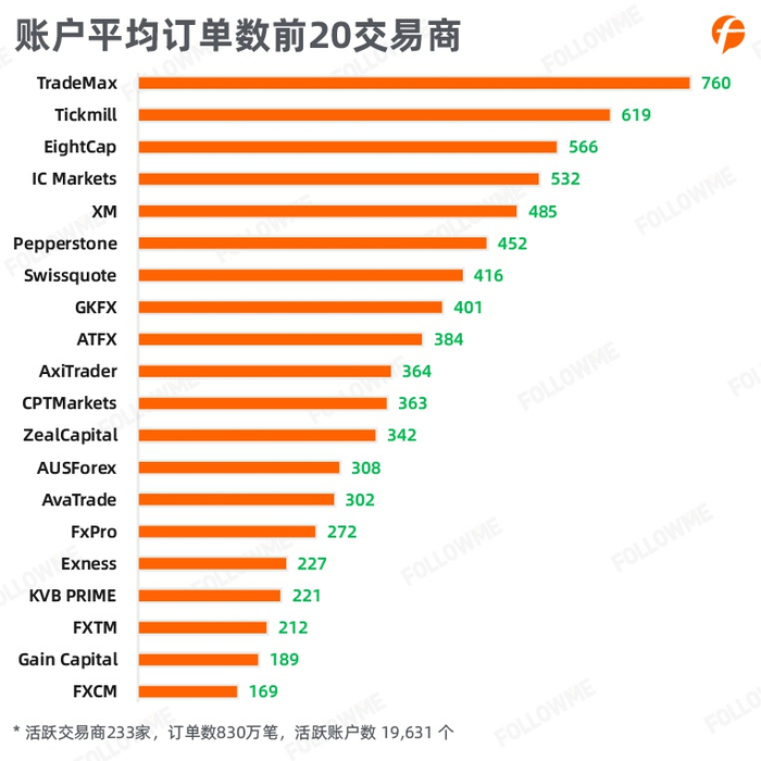2020上半年,FOLLOWME 交易社区活跃交易商共有233家,连接账户数近 20,000 个,成交了830万笔订单,交易账户平均订单数424笔,其中账户平均订单数前20的交易商均在160笔以上,最高者多达760笔。