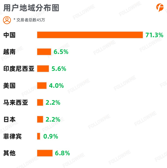 从地域分布来看,中国地区用户数最多,占所有用户数的71.3%,其次是越南和印度尼西亚,分别占6.5% 和5.6%。值得注意的是,前五名中东南亚国家占了三席,说明东南亚国家外汇市场拥有巨大的发展潜力。