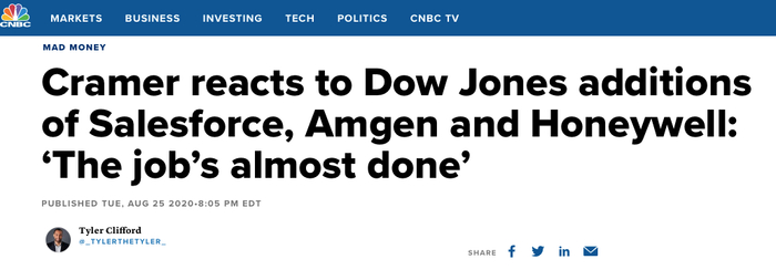 8月24日,埃克森美孚、辉瑞和Raytheon Technologies Corp.被剔除出道琼斯工业平均指数,取而代之的是Salesforce.com、安进和霍尼韦尔,后者将成为这一拥有124年历史的基准指数的成分股。这是该指数七年来最大调整的一部分。此前,苹果的拆股决定降低了计算机和软件股票在该基准指数中的影响力,进而触发了上述调整。苹果当前在这个包含30个成份股的指数的权重为12%。
