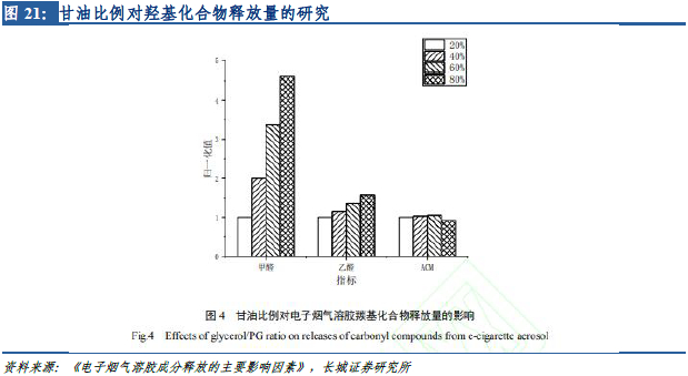 2)烟油中甘油(丙三醇)含量。在80w的功率下,抽吸20口所释放的甲醛含量与甘油比例成正比。甘油在电子烟液中的比例通常在30%-70%之间,高功率电子烟配套的烟液甘油比例普遍较高,原因是高功率产品通常追求烟雾的释放量,而甘油比例越高,烟雾量越大。