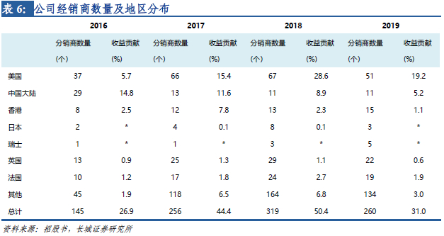 公司全部自有品牌产品及部分代工产品采用分销模式,截至2019年末公司拥有260家分销商,主要位于而美国、法国及英国。2019年,公司对分销商进行优化梳理,年末经销商数量较2018年末下降59家。
