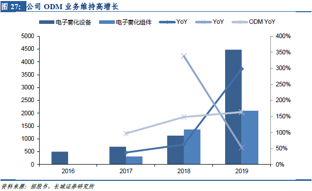 ODM业务整体维持高速增长。2017-2019年ODM业务复合增速达134.4%,收入规模从2016年的5.1亿元增长至2019年的65.7亿元。其中电子雾化设备和电子雾化组件的收入复合增速分别达到107.2%和576.9%。2019年电子雾化设备实现收入44.8亿元,同比+298.3%;电子雾化组件实现收入20.9亿元,同比+52.9%。
