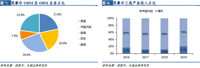 美国区域收入占比接近50%,2019年中国大陆收入占比迅速提高。分区域看,2019年公司来自中国大陆地区的收入占比为20.9%,海外地区收入占比为79%;其中美国、香港、日本的收入占比分别为21.8%、26.4%、7.9%。公司香港地区收入主要以再出口或转运为主,其中绝大部分产品销往美国,因此美国地区2016-2019收入实际占比分别为55.4%、49.9%、52.4%和46.5%。