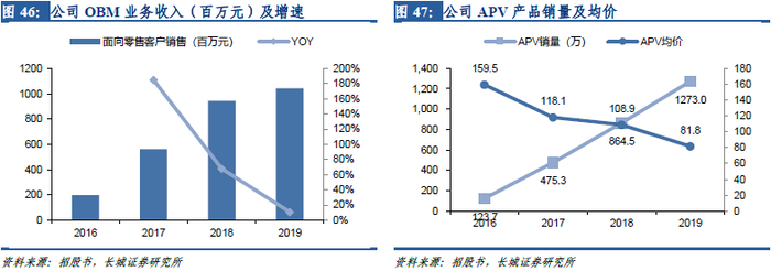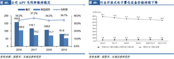 开放式大烟行业增速放缓,公司OBM业务销量保持快速增长。由于封闭式小烟的兴起,开放式大烟的份额逐渐下降,目前开放式大烟的主要终端客户为电子烟玩家群体。但根据招股书中弗若斯特沙利文预测,2021-2024年开放式电子烟市场规模仍将保持着20%左右的稳健增长。2019年公司OBM业务实现营业收入10.4亿元,同比+10.6%。其中销量同比增加47.3%至1273万台,单价同比下降24.9%至81.8元。公司APV销量保持着较快的增长,单价下滑的原因与APV产品结构调整及核心原材料锂电池价格下降有关,APV产品采取成本加成定价法,毛利率保持稳定。