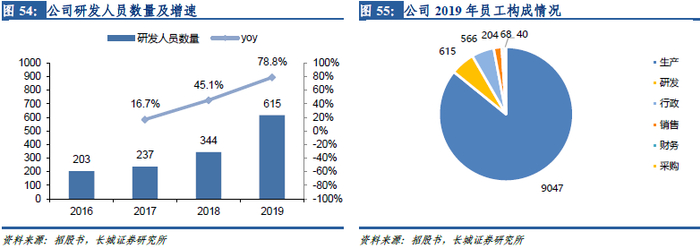 研发团队加速扩张,核心技术人员经验丰富。首席科学家Dr. Shi毕业于清华大学和美国佐治亚理工学院,有25年陶瓷相关材料的研究经验。公司研发人员数量呈加速增长趋势,截至2019年末,公司研发人员数量已达到615人,同比增长78.8%,占员工总人数的比例为5.8%。技术团队的不断扩张为公司后续的技术储备奠定基础,技术优势有望长期保持。
