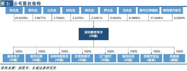 管理团队稳定,实际控制人具有较强的业务经营能力。截至上市前,公司董事长、CEO陈志平先生持有38.5%的股权,其一致行动人、公司执行董事兼副总经理熊少明先生持有5.85%股权,合计持有44.35%股权,为公司实际控制人。陈志明先生为麦克韦尔创始人,与熊少明先生自麦克韦尔成立之初便开始负责公司的整体管理及业务运营工作,两位实控人具有较强的业务经营管理能力。公司其余持股高管包括董事会秘书邱凌云(持股2.48%)、运营总监罗春华(持股0.57%),高管团队与公司通过股权绑定,且团队稳定性较强。