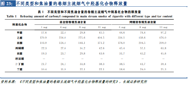 同时,对于传统卷烟而言,焦油含量与甲醛释放量正相关,根据论文《不同类型和焦油量的卷烟主流烟气中羟基化合物释放量的研究》中的测试结果,焦油含量在3mg-11mg的卷烟释放的甲醛在17.6 -97.2μg/支,按每支卷烟可抽10-15口测算,100口卷烟烟气中甲醛含量在123-970μg,高于上文电子烟测试的中位数。综上可以认为,封闭式小烟甲醛含量较低,且明显低于传统卷烟,但开放式大烟甲醛超标的风险较高。