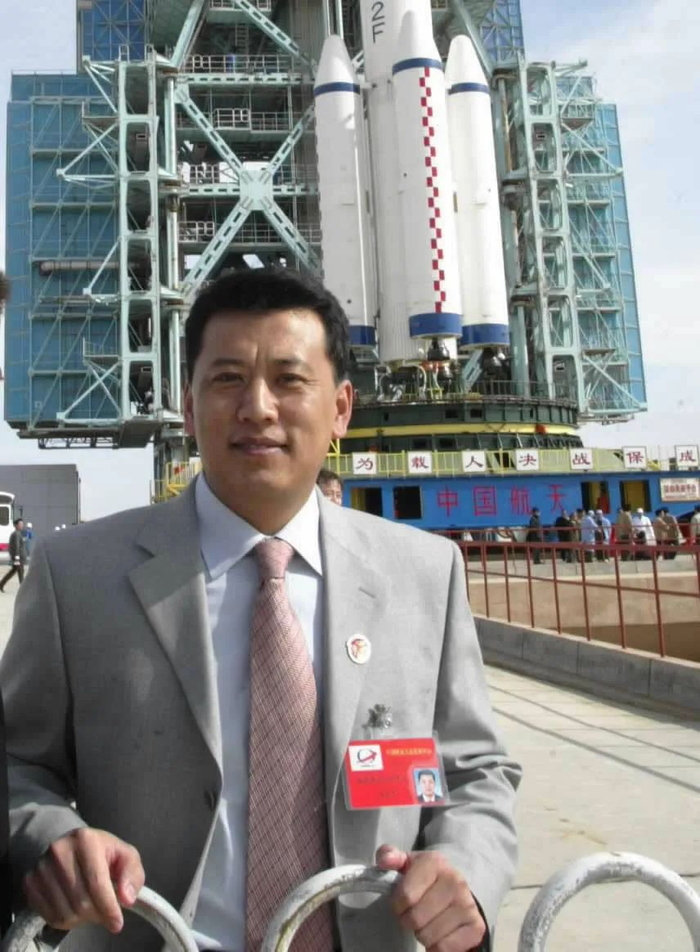 袁家军在神舟五号载人飞船前留影。新华社发