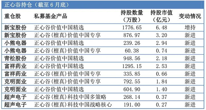 具体来看,二季度正心谷继续加仓新宝股份,正心谷价值中国精选二季度增持888.67万股至1776.65万股,正心谷价值中国专享新进876.97万股,两只产品合计重仓新宝股份接近10亿元。