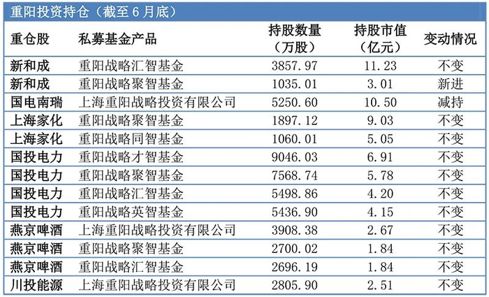 私募大佬裘国根执掌的重阳投资,二季度继续保持稳健的投资风格,仍坚定持有国投电力和上海家化。具体来看,重阳投资旗下4只产品合计持有2.76亿股国投电力,同时持有上海家化2957.13万股,持有川投能源2805.9万股。