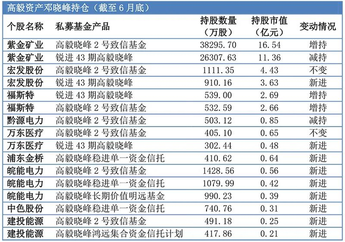 数据显示,高毅资产首席投资官邓晓峰在今年二季度新进了建投能源,加仓了万东医疗、福斯特、宏发股份等公司,对紫金矿业仍然重仓持有,同时减持了黔源电力。