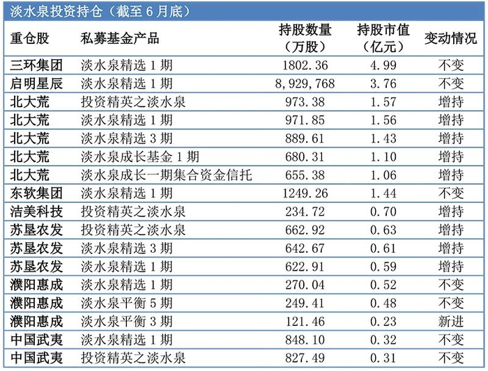 另外,坚持逆向投资的老牌百亿私募淡水泉,则对农业股“爱得深沉”,二季度增持了北大荒、苏垦农发等股票。此外,淡水泉继续持有三环集团、启明星辰、东软集团等公司。