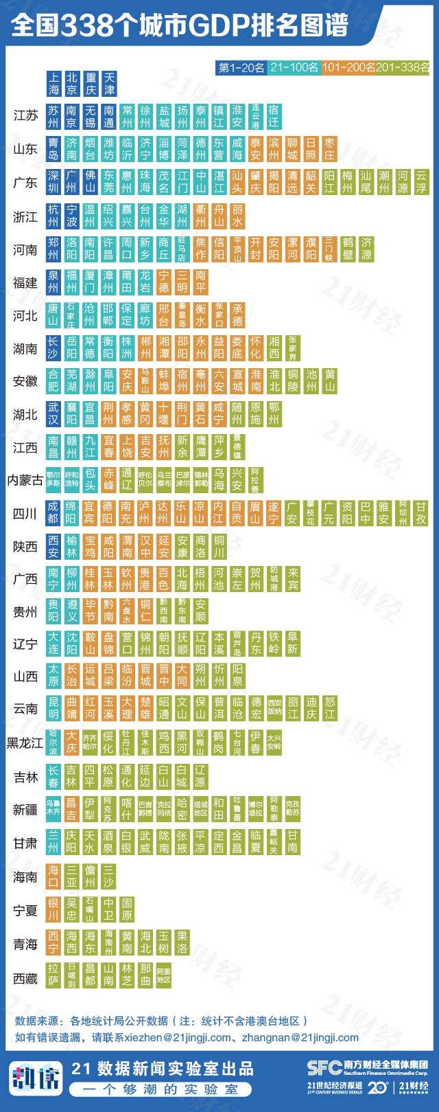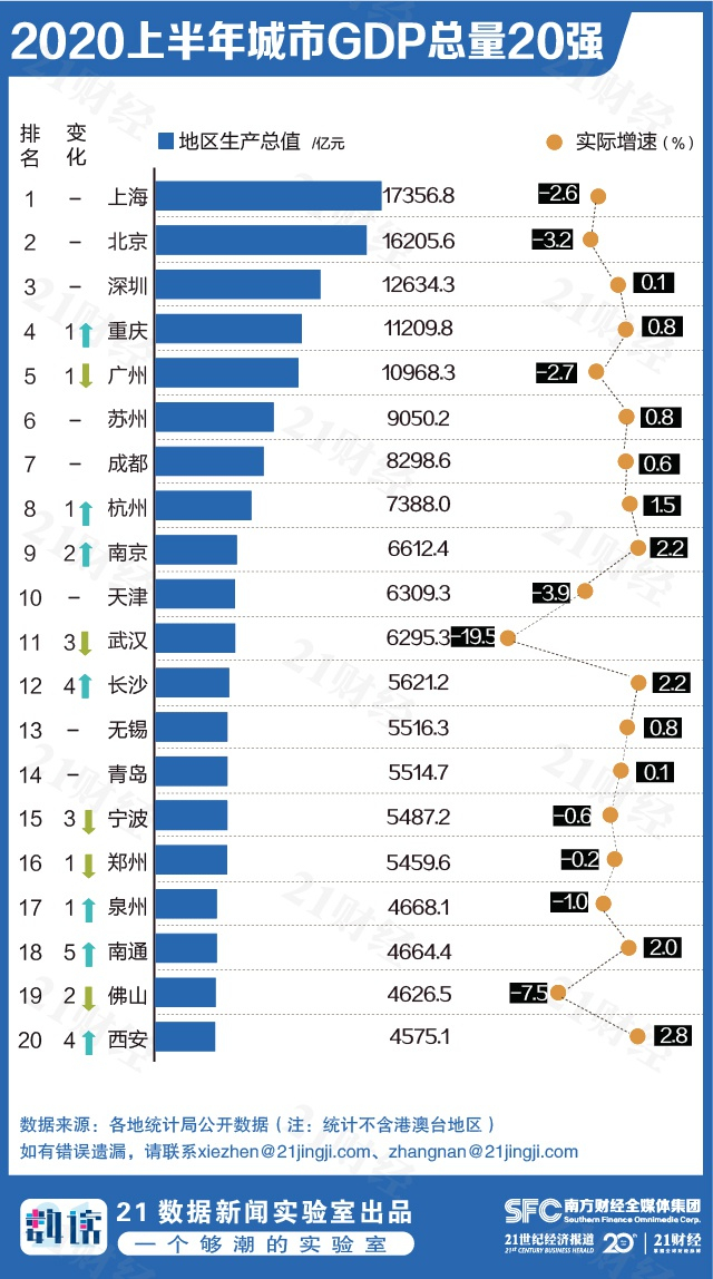 21数据新闻实验室统计338个城市(包括州、地区、盟,港澳台未计入,下文皆以城市统称)上半年经济数据,得出“2020年上半年城市GDP百强榜”。