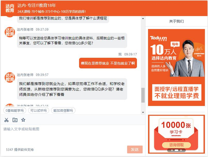 中新经纬客户端以学员身份就此向达内教育客服咨询,客服称,培训都是推荐到就业的。“都是推荐到您就业为止,如果您觉得工作不合适,和学校老师反馈,重新给您推荐到您满意为止。”达内教育客服称。但对于能否赔付学费的问题,客服始终没有正面回答。