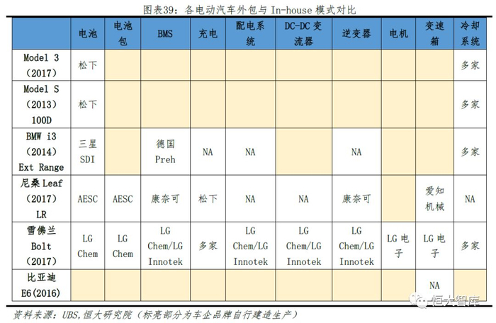 2)生产制造:特斯拉奉行高度垂直整合的生产模式,在电芯、电机等核心零部件上基本采用自主设计+代工或者合资的形式,牢牢把握供应链主导权,通过规模效应不断降低成本。根据瑞银拆解测算,Model3电芯成本约110美元/KWh,低于LG、CATL等其他主流电芯制造商。