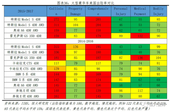 对比同等大型豪华轿车的出险率,从三项车体保护险来看,特斯拉与其他豪华轿车类似,表现较差,且数据远远高于其他同类型轿车,说明特斯拉单车平均碰撞率高于行业平均水平,这也暗示由于系统误判或者驾驶员忽视容易造成更多碰撞。但从三项人体保护险来看,特斯拉Model S低于平均、基本处于优秀水平,说明Model S对自身车主和对方车主有良好的人身保护。