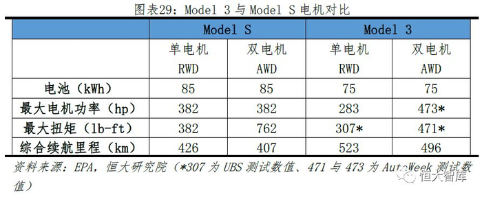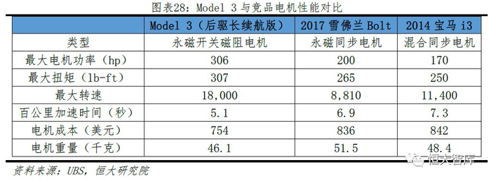 Model 3对传统开关磁阻电机做了一定的改良:在定子加入少量稀土,并设计了控制算法来平滑扭矩波动,最终提高了电机输出功率。Model 3的永磁开关磁阻电机具有体积小、成本低(稀土使用量非常少,而且无需使用铜芯,降低铸造成本)、功率高等优点。相比于Model S/X感应电机83%的能量转化效率,Model3的能量转化效率提升至89%,即89%的电能可以最终转化为驱动力,这样便进一步降低了电耗,提高了续航里程。