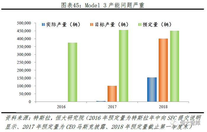 一、产能问题。特斯拉的产能一直备受诟病,由于产能不足而导致的生产能力与产品预定量不匹配、交付延迟严重等。由于Model 3订单与实际产量偏离程度最高,特斯拉2017年年底以来暴露的产能问题愈加严重。2017年第三季度Model 3实际产量仅260台,远低于1500台预期,主要因为早期电池超级工厂Gigafactory 1还未正式量产,人工组装电池包速度慢。电池量产问题得到解决后,Model3产能问题依然未得到解决,主要因为产线过于高度自动化。针对生产组装的GA3产线自动化程度高达90%以上,生产一台汽车匹配数百条机器设备,产线过于密集,机器设备过多导致作业时间冲突、效率和灵活性下降,激增的维护成本抵消掉自动化带来的成本优势。因此,特斯拉曾于2018年2月、4月停产维护GA3产线,降低自动化程度并加入更多人手,此外还开设帐篷产线GA4增加生产速度。2018年6月Model 3达到目标周产能5000辆,目前周产量约7000辆。即便如此,特斯拉按时完成交付任务依然艰难,按照2017年年底Model 3约45.5万订单、2018年实际交付14.7万计算,不考虑新增订单,剩余订单还需1年左右时间完成。