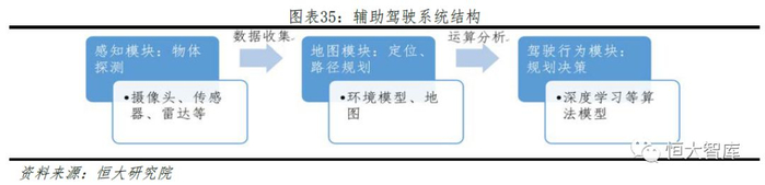 汽车辅助驾驶系统由软硬件组合构成,从结构框架来看,主要分为感知模块、地图模块、驾驶行为决策模块。从流程来看,感知模块通过雷达、传感器、摄像头等硬件,收集周围环境探测到的物体数据,地图模块提供定位和全局路径规划,数据共同传输到驾驶行为模块,为驾驶方案提供信息支持,最后决策模块控制车体转向、加速等实施行为。