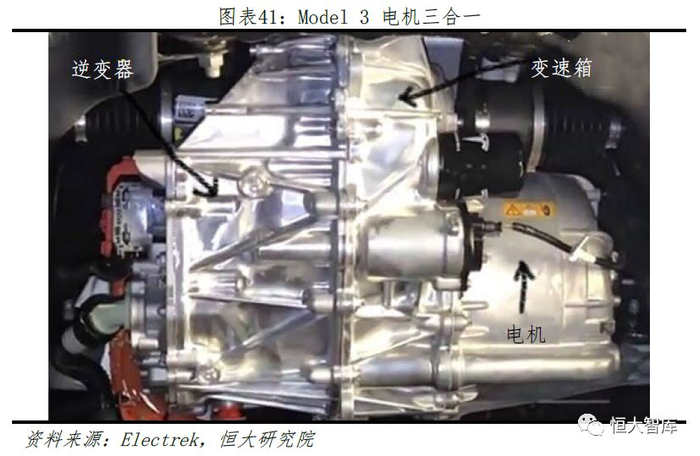 动力总成集成优化内部结构,有利缩减车型降低成本,形成价格竞争力。特斯拉一直保持包括电池包、BMS、冷却系统、电机等动力总成高度集成的特点。例如,无论是感应电机还是永磁开关磁阻电机,基本结构都为变速箱、逆变器和电机三体合一的结构。对比来看,每次推出新款车型,特斯拉都尽可能在原基础上集成升级。对比Model S/X,Model 3的车体减小约20%、价格降低约50%,为保证整车性能,特斯拉加入更多系统芯片来控制部件协调运作,并且将例如Model3的冷水机、电动阀、液冷罐等零部件集成为冷却液储阀罐,即Super Bottle,通过算法调节内部线路串并联结构,减少例如PTC加热器等零部件。