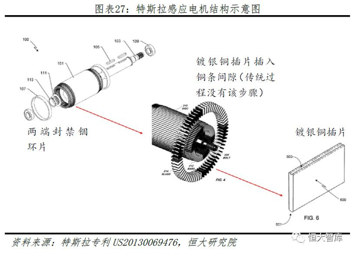 为提高传统感应电机功率和运作效率,特斯拉采取一系列包括设计对应冲片、提高扭矩、冷却系统等手段,其中,最为创新的是感应电机铜芯转子专利技术(专利号US20130069476)。