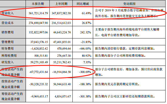 营收大幅增长的原因,是2019年5月底整合数字绘画业务,积极拓展海外市场,笔智能交互业务大幅增长。因为该业务增长迅猛,汉王科技还需要增加库存,经营活动产生的现金净流出达到6777万元,去年同期1691万元,主要原因就是因为销售良好,增加备货,预付供应商货款增加。