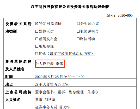 8月28日, 个人投资者李伟钱来调研,在汉王大厦第五会议室,当天宾主双方对话一个半小时。