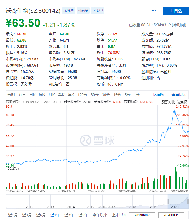 如果从1月份算起,智飞股价的最高涨幅超过3倍,最高市值突破3000亿。而沃森年初才30元/股,如今已涨至约61.95元,市值最高接近1300亿。