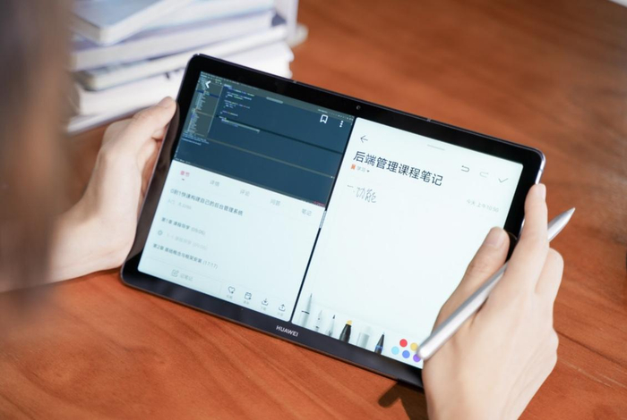 在自主学习的时候,还可以利用它的大屏幕优势,进行“智慧分屏”。在屏幕右侧拖出dock区,快速选取两个应用,拖拉至屏幕上,即可实现应用分屏,屏幕左边显示一个应用,右边同时显示另一个应用内容。例如屏幕一侧是学习视频,另一侧则打开华为备忘录,一边看视频一边记录课程笔记,让学习更高效。