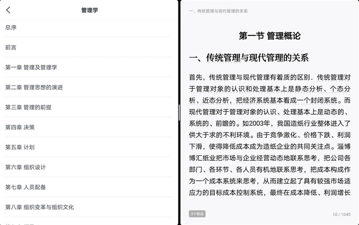 华为MatePad 10.8还带来了目前安卓平板上绝无仅有的“平行视界”功能,也就是在横屏显示状态下,一个应用的不同界面信息左右分屏显示,充分发挥平板大屏特质,让安卓平板的使用体验有了革命性突破。比如打开B站学习,那么通过平行视界,左侧显示为视频列表,右侧则是视频详情,这使得无论是学习,还是娱乐,都更加便利;或者阅读学习资料,左边是目录,右边是内容。