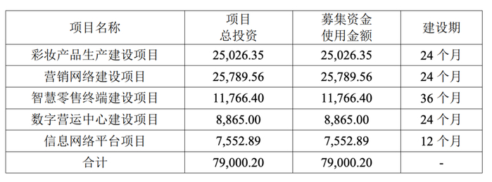 其中,彩妆产品生产建设项目、营销网络建设项目计划使用募集资金均超过2.5亿元,建设期为2年,目前时间已过半。