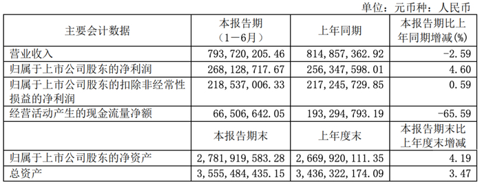 2020年上半年,丸美股份实现营业收入7.94亿元,同比下降2.59%;实现归属净利润2.68亿元,同比增长4.60%;实现扣非净利润2.19亿元,同比增长0.59%。