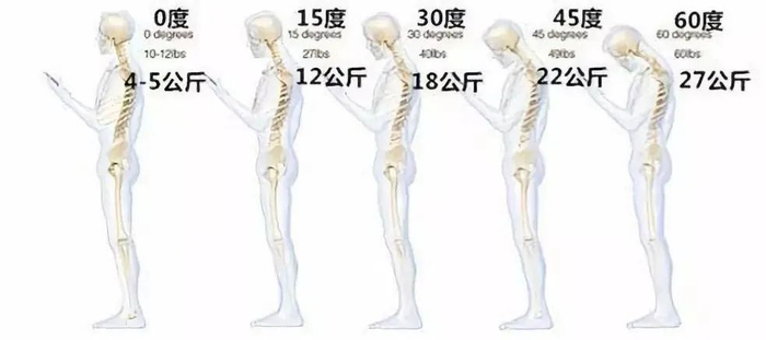 长期低头带来的危害是潜在的,脑袋越低,颈椎的压力就越大,对健康的影响也越大。