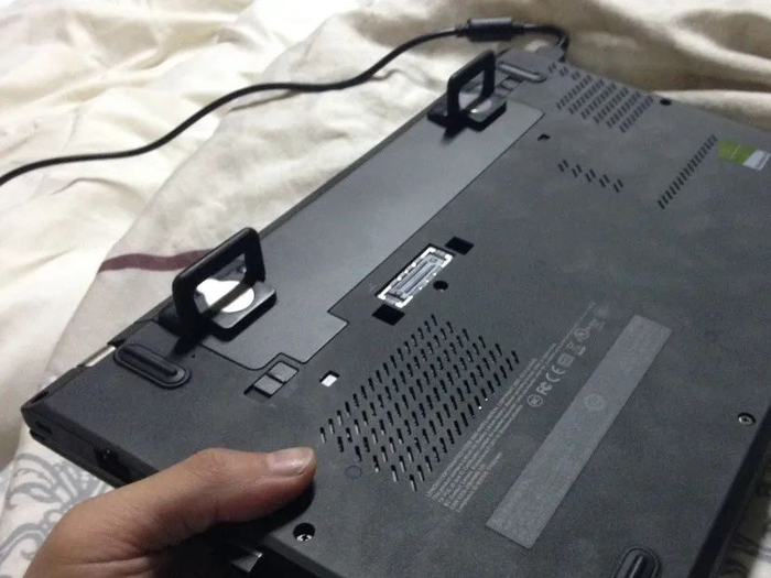 把电脑前端卡在这里,电脑就不会再往前滑了,免得掉到桌下去。