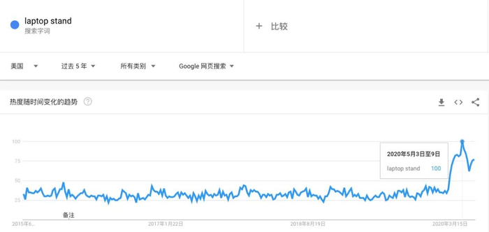 这是一个搜索引擎热搜词随时间变化的表,近5年来,笔记本电脑支架(laptop stand)一直都有热度,但从2月底开始一路飙升。