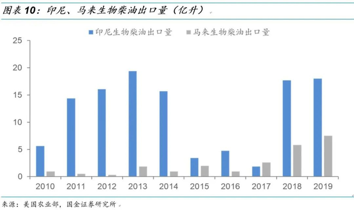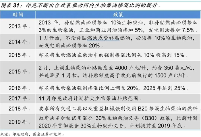 而为了保证国内相关产业的发展,印尼等国家不断出台相关生物柴油添加政策,至2019年,印尼已经将交通运输领域的生物柴油添加比例提升至30%,并给予大量补贴,成为目前全球添加生物柴油比例最高国家之一,随着其本国添加比例的进一步提升,印尼、马来可能成为以棕榈油生产生物柴油应用的主要市场。