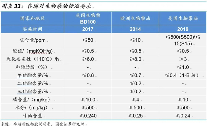 欧盟生物柴油标准要求高于国内,高品质达标产品有望获得更高的盈利空间。欧美等地区的生物柴油标准主要依据以植物油为原料的标准确定,对硫、磷、酸值、甘油酯等指标要求严格,而我国主要以废弃油脂为原料,来源复杂,杂质含量差异大,因而需要实现有效的技术突破才能达到高标准的产品要求。过去我国虽然常以废旧油脂作为原料,但是规模化生产高品质生物柴油,因而我国生物柴油多以自用为主,产品出口较少。伴随着国内生物柴油技术水平的突破,国内生物柴油企业开始出口海外,逐步可以获得更高的盈利空间。