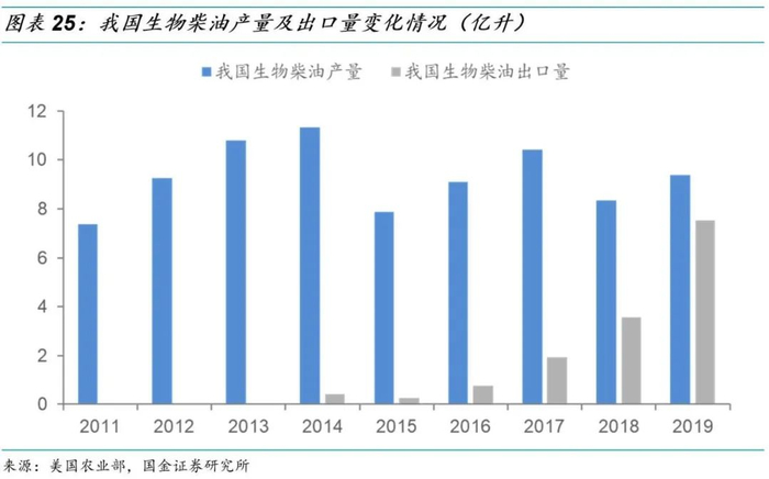 我国生物柴油生产技术水平升级,生物柴油产品出口提升。在我国发展废旧油脂生产生物柴油早期,国内产品主要以油品加工纯化为主,用于国内锅炉燃料等领域,而伴随着下游生物柴油生产技术的升级,我国的生物柴油可以逐步满足国外标准要求,实现产品出口,2019年根据USDA数据,我国生物柴油出口量提升至7.5亿升,5年复合增速为70%以上。通过产品出口,我国的废旧油脂产品附加值有望获得进一步提升,从而逐步带动行业快速发展。